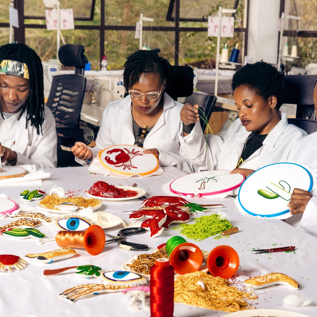 Each piece is hand-beaded in our Maai Mahiu studio and conceptualized through a creative collaboration between Amal and Sam, a talented artist and maker in our studio — and the son of Monicah, one of our original maker mums.
