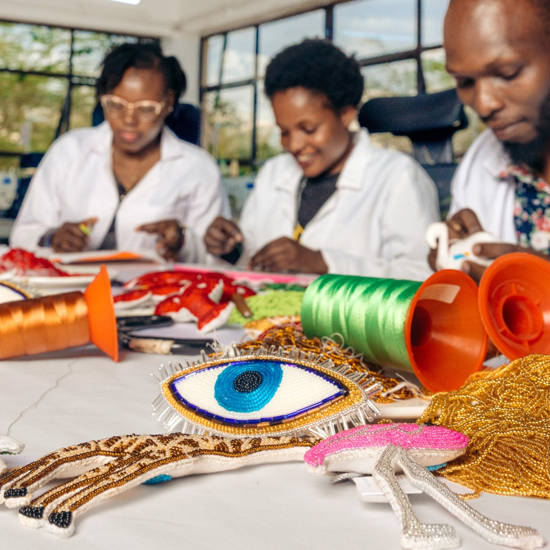 Each piece is hand-beaded in our Maai Mahiu studio and conceptualized through a creative collaboration between Amal and Sam, a talented artist and maker in our studio — and the son of Monicah, one of our original maker mums.