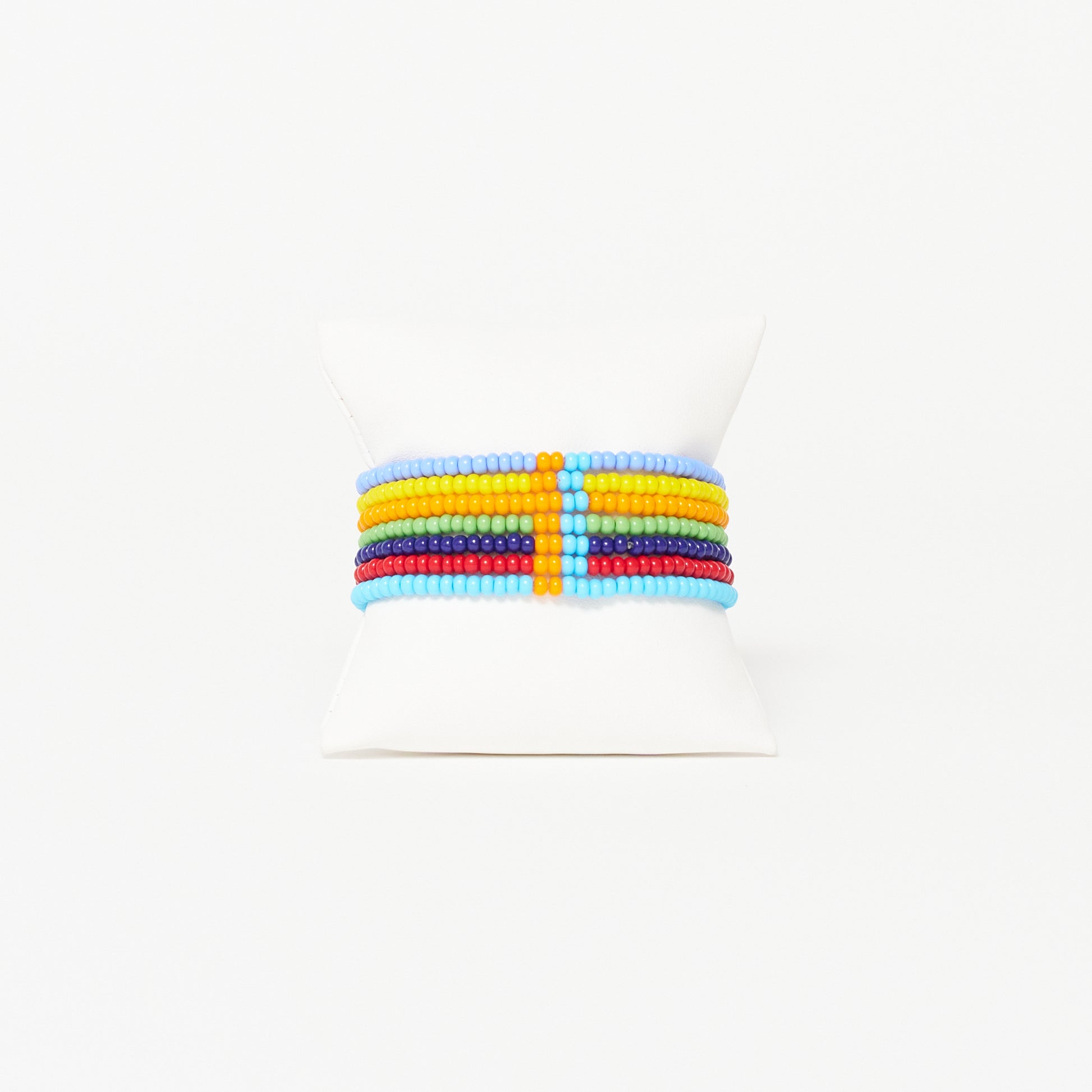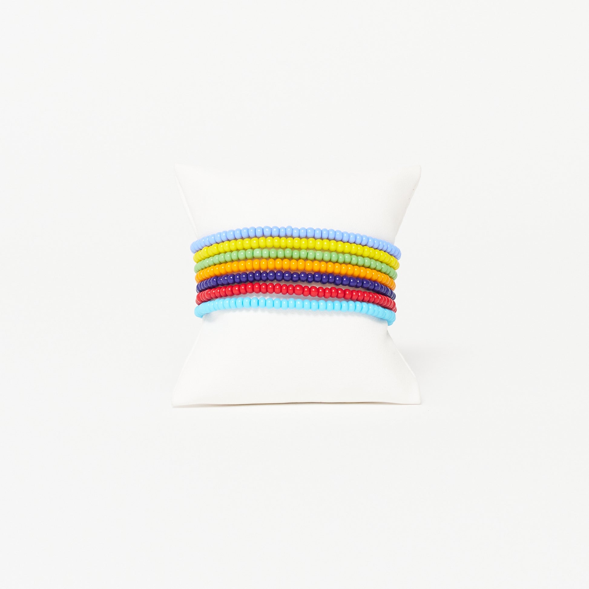 A colorful 7-pack of super-fun elastic single-strand bracelets. Wear them together as a statement, or share the pack with friends.