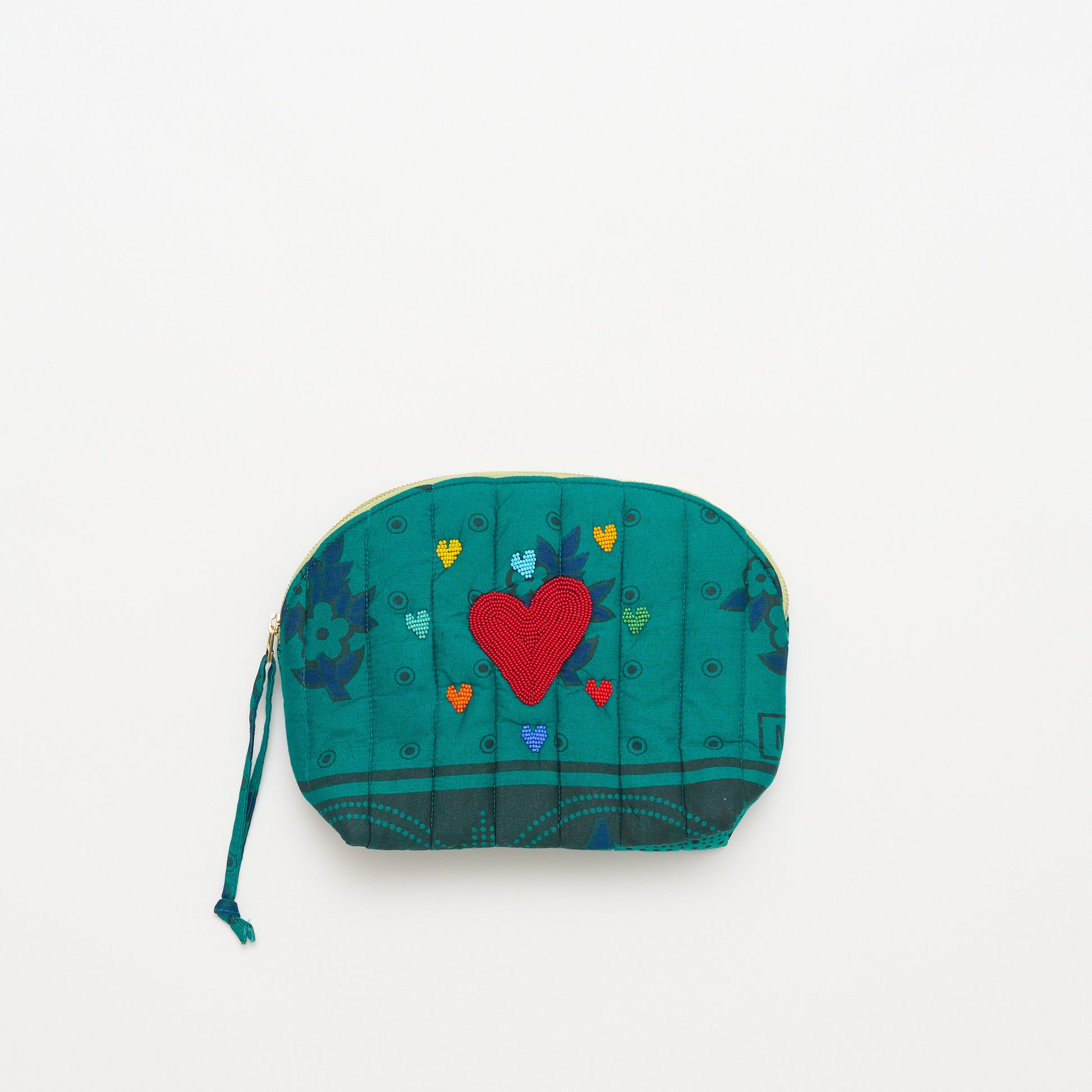 A pouch with soul—and a story. Made from a mix of vintage Kanga textiles sourced across Kenya, each one-of-a-kind pouch is quilted for a soft, sculptural feel and finished with colorful hand-beaded hearts, crafted by our Maasai Maker Mums. The vibrant mix of prints means no two are ever the same—each pouch carries its own character and charm.