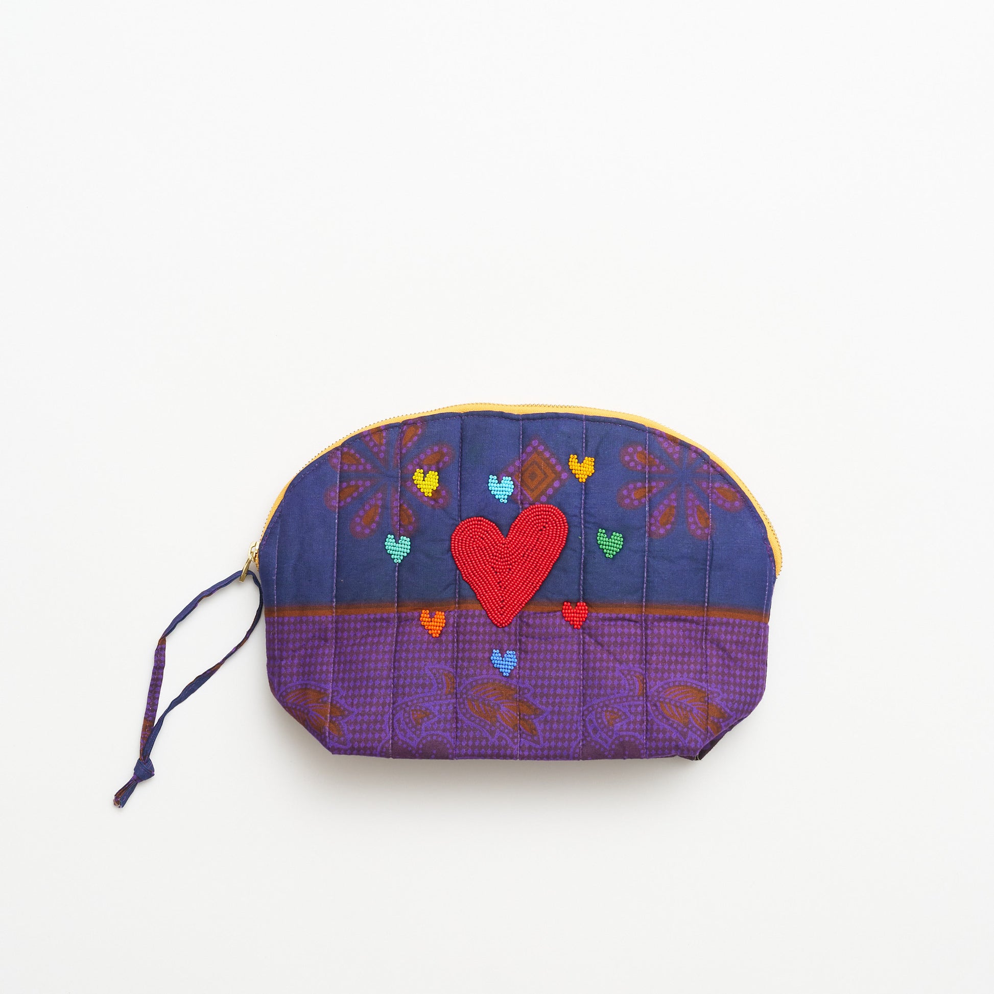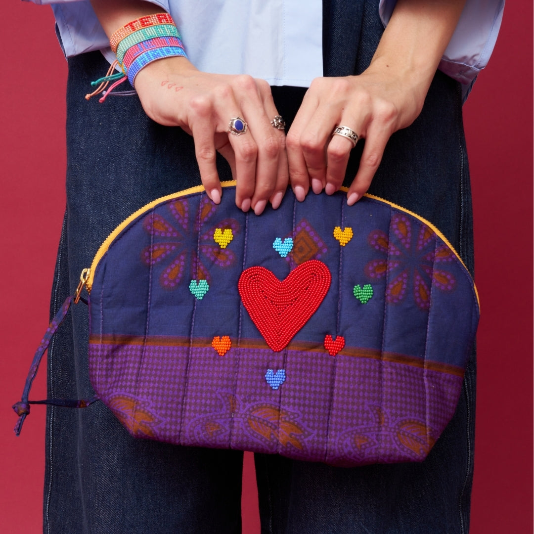A pouch with soul—and a story. Made from a mix of vintage Kanga textiles sourced across Kenya, each one-of-a-kind pouch is quilted for a soft, sculptural feel and finished with colorful hand-beaded hearts, crafted by our Maasai Maker Mums. The vibrant mix of prints means no two are ever the same—each pouch carries its own character and charm.