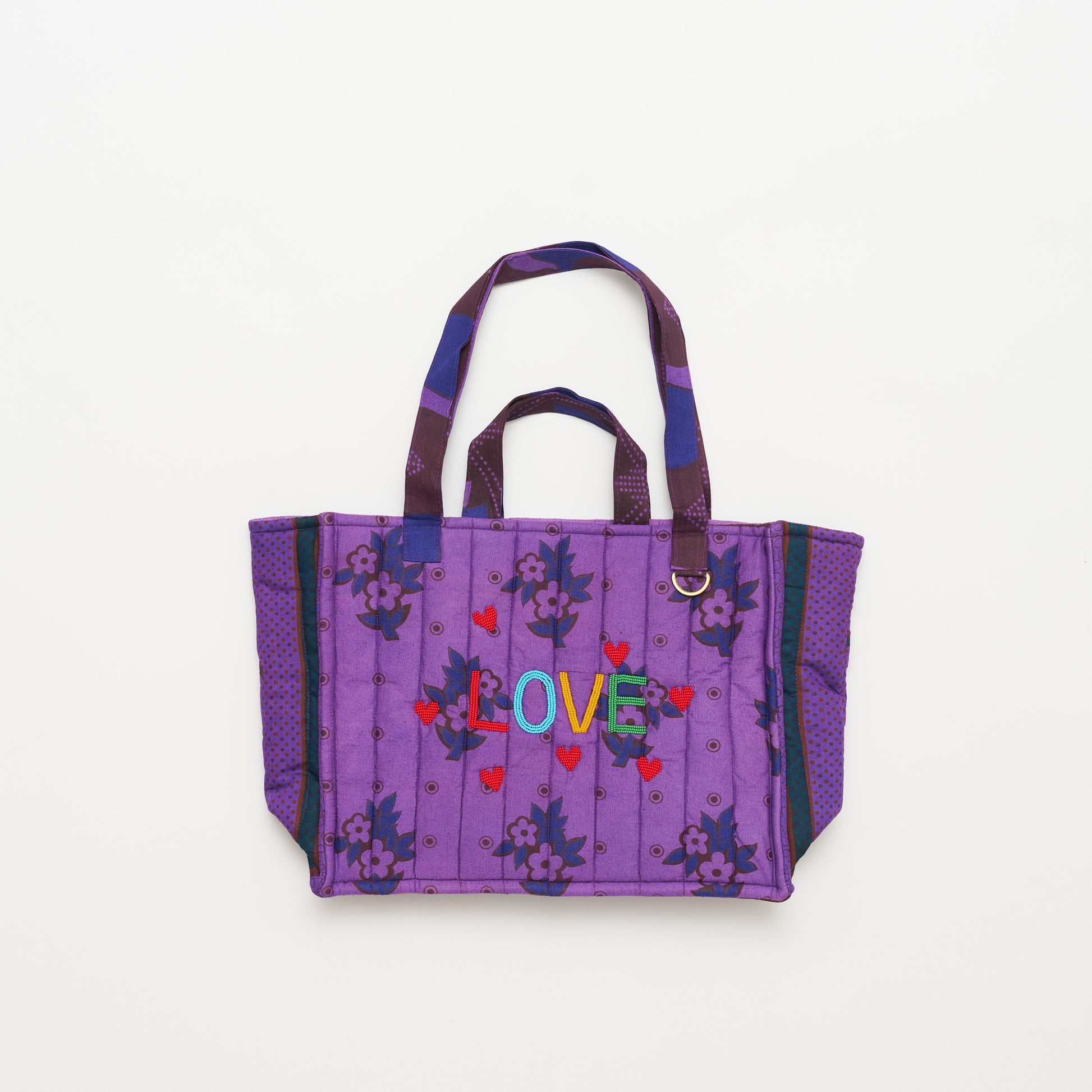 Spread the love—boldly and beautifully. This one-of-a-kind tote is made from a vibrant mix of vintage Kanga textiles sourced in Kenya, quilted for texture and structure, and finished with the word LOVE and hand-beaded hearts, directly beaded onto the bag by our collective of Maasai Maker Mums.