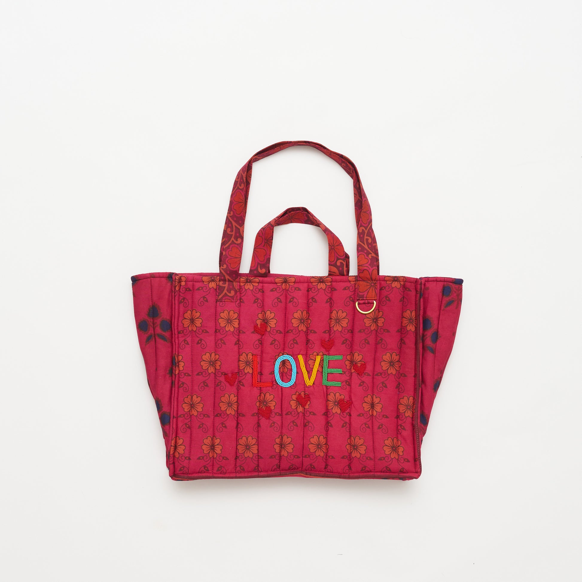 Spread the love—boldly and beautifully. This one-of-a-kind tote is made from a vibrant mix of vintage Kanga textiles sourced in Kenya, quilted for texture and structure, and finished with the word LOVE and hand-beaded hearts, directly beaded onto the bag by our collective of Maasai Maker Mums.