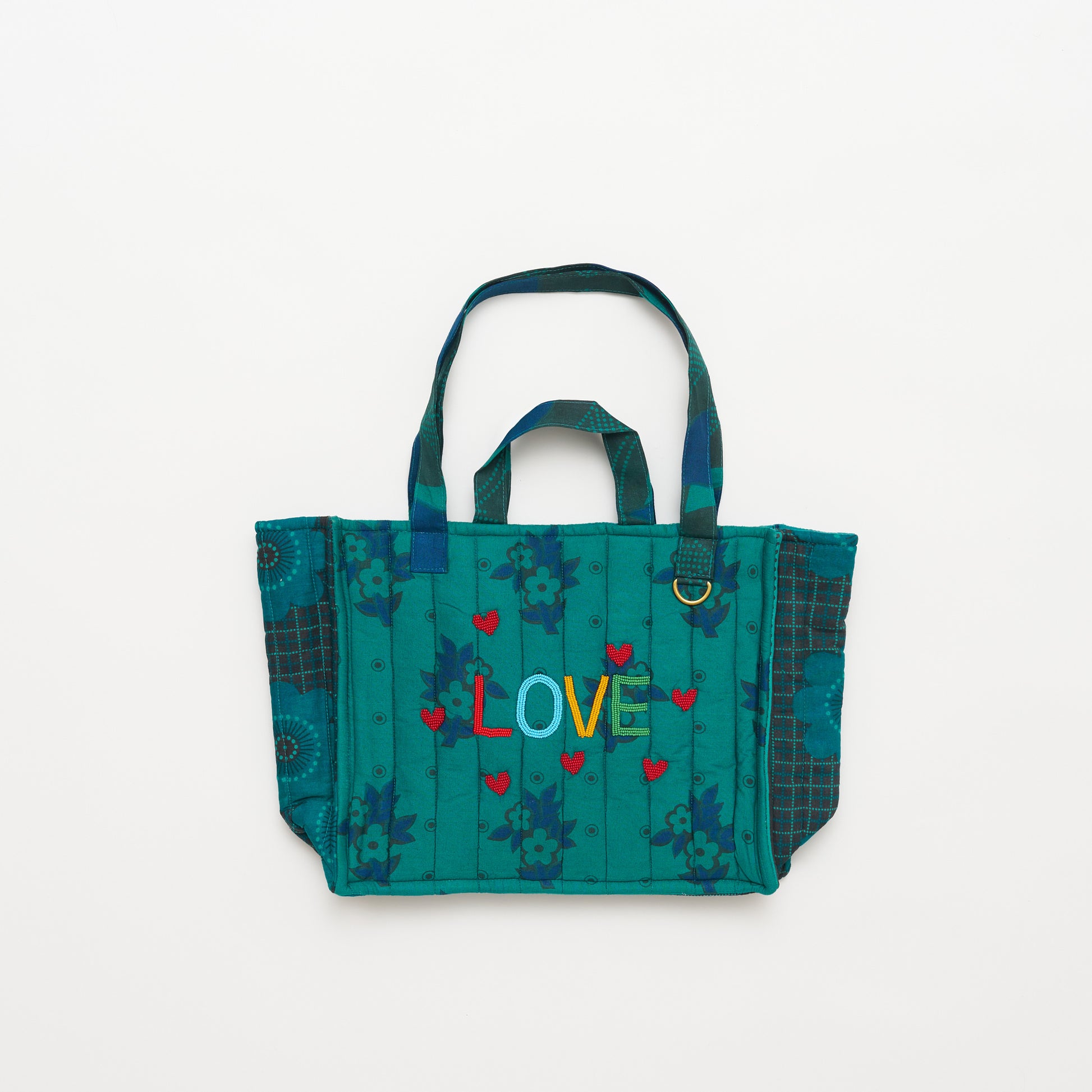 Spread the love—boldly and beautifully. This one-of-a-kind tote is made from a vibrant mix of vintage Kanga textiles sourced in Kenya, quilted for texture and structure, and finished with the word LOVE and hand-beaded hearts, directly beaded onto the bag by our collective of Maasai Maker Mums.